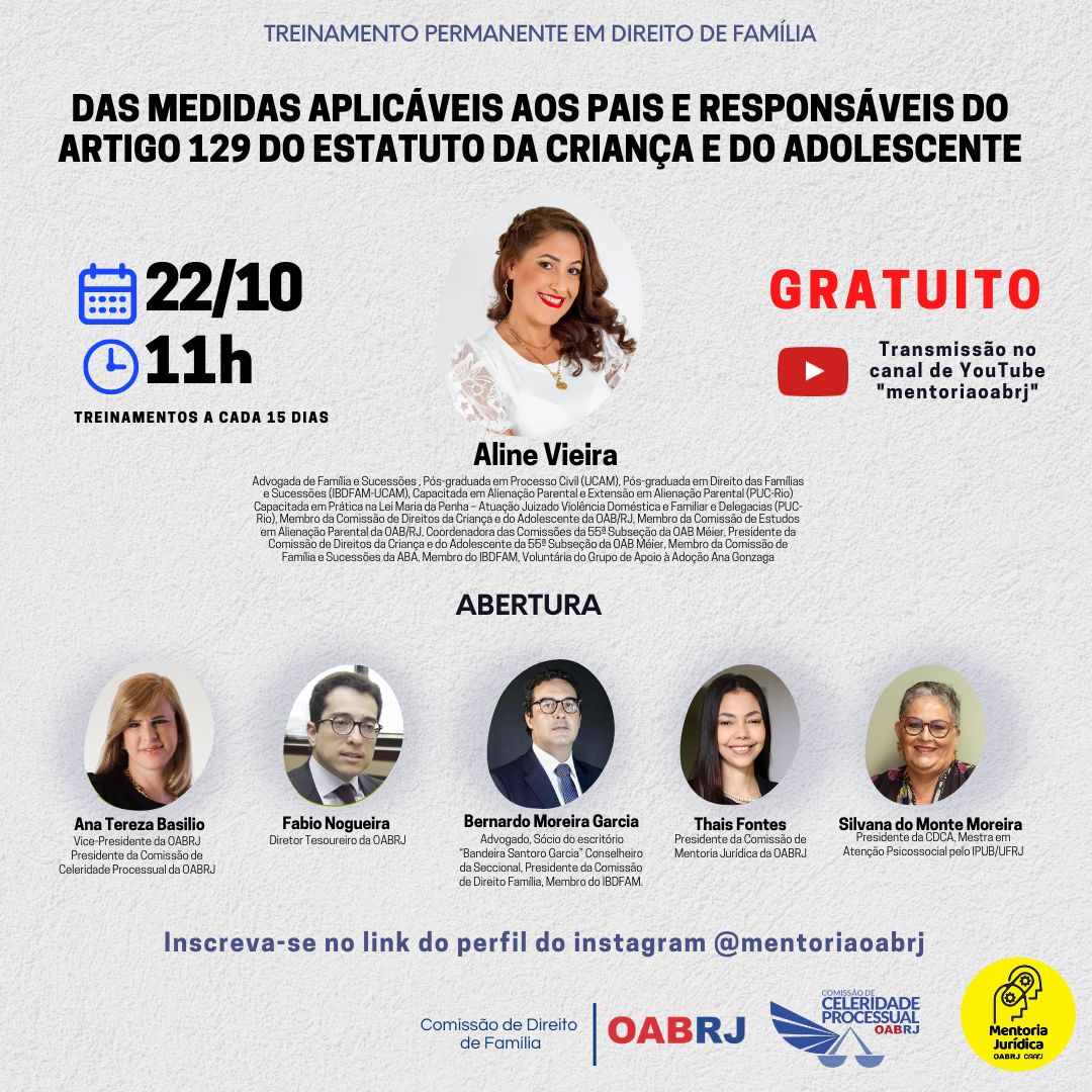 Vice-presidente da OAB-RJ e presidente da comissão de celeridade processual, Ana Tereza Basílio vai participar, nesta terça-feira, dia 22, às 11h, Treinamento Permanente em Direito de Família, com o tema ” Das medidas aplicáveis aos pais e responsáveis do artigo 129 do Estatuto da Criança e do Adolescente “, com transmissão pelo canal YouTube mentoriaoabrj.