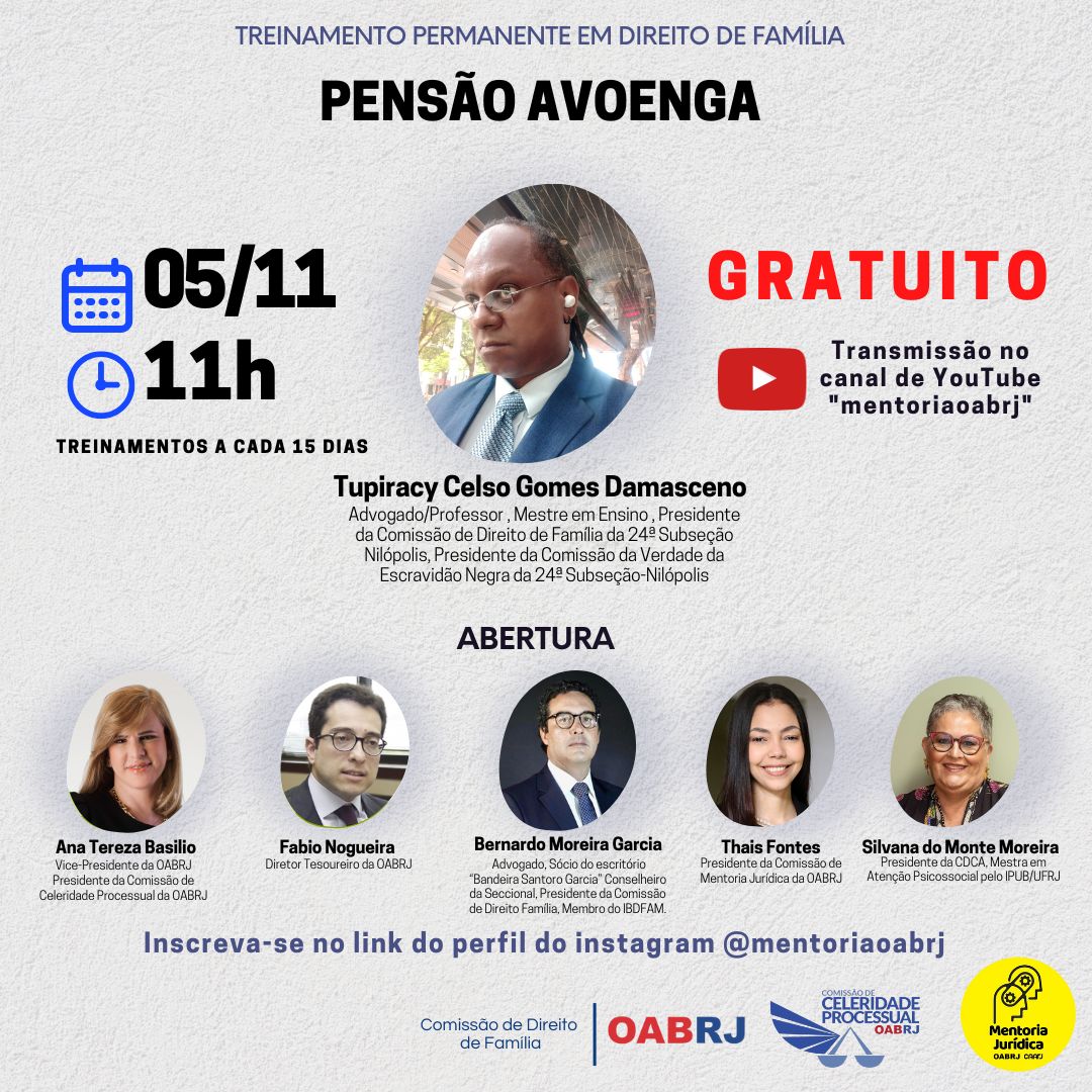Também estarão no encontro virtual, o Diretor Tesoureiro da OAB-RJ, Fabio Nogueira, a presidente da comissão de Mentoria Jurídica, Thais Fontes, a presidente da CDCA, Silvana do Monte Moreira e o advogado Bernardo Moreira Garcia.