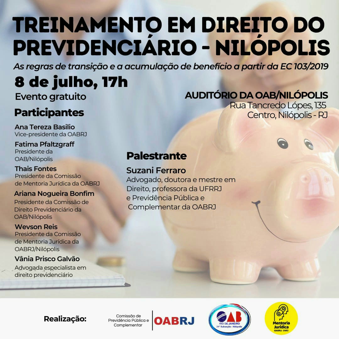 Também dará palestra, no encontro presencial, a advogada Susani Ferraro, a presidente da OAB de Nilópolis, Fatima Pfaltzgraff, a presidente da comissão de Mentoria Jurídica, Thaís Fontes, a presidente da comissão de Direito Previdenciário da OAB de Nilópolis, Ariana Nogueira Bonfim, e os advogados Wevson Reis e Vânia Prisco Galvão.