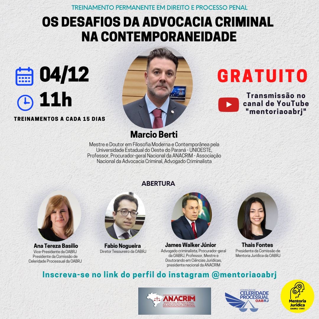 Também estarão no encontro virtual, o Diretor Tesoureiro da OAB-RJ, Fabio Nogueira, a presidente da comissão de Mentoria Jurídica, Thais Fontes, o presidente nacional da ANACRIM,  James Walker e o advogado Marcio Beti.