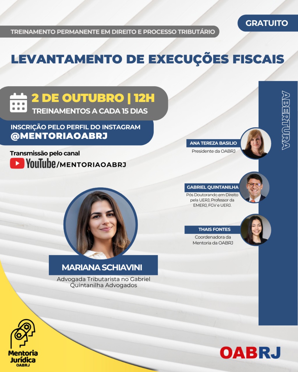Presidente da OAB-RJ, Ana Tereza Basílio vai proferir a palestra de abertura do Treinamento Permanente em Direito e Processo Tributário, nesta quinta-feira, dia 2 de outubro, às 12h, pelo canal YouTube mentoriaoabrj, com o tema “Levantamento de Execuções Fiscais”.
