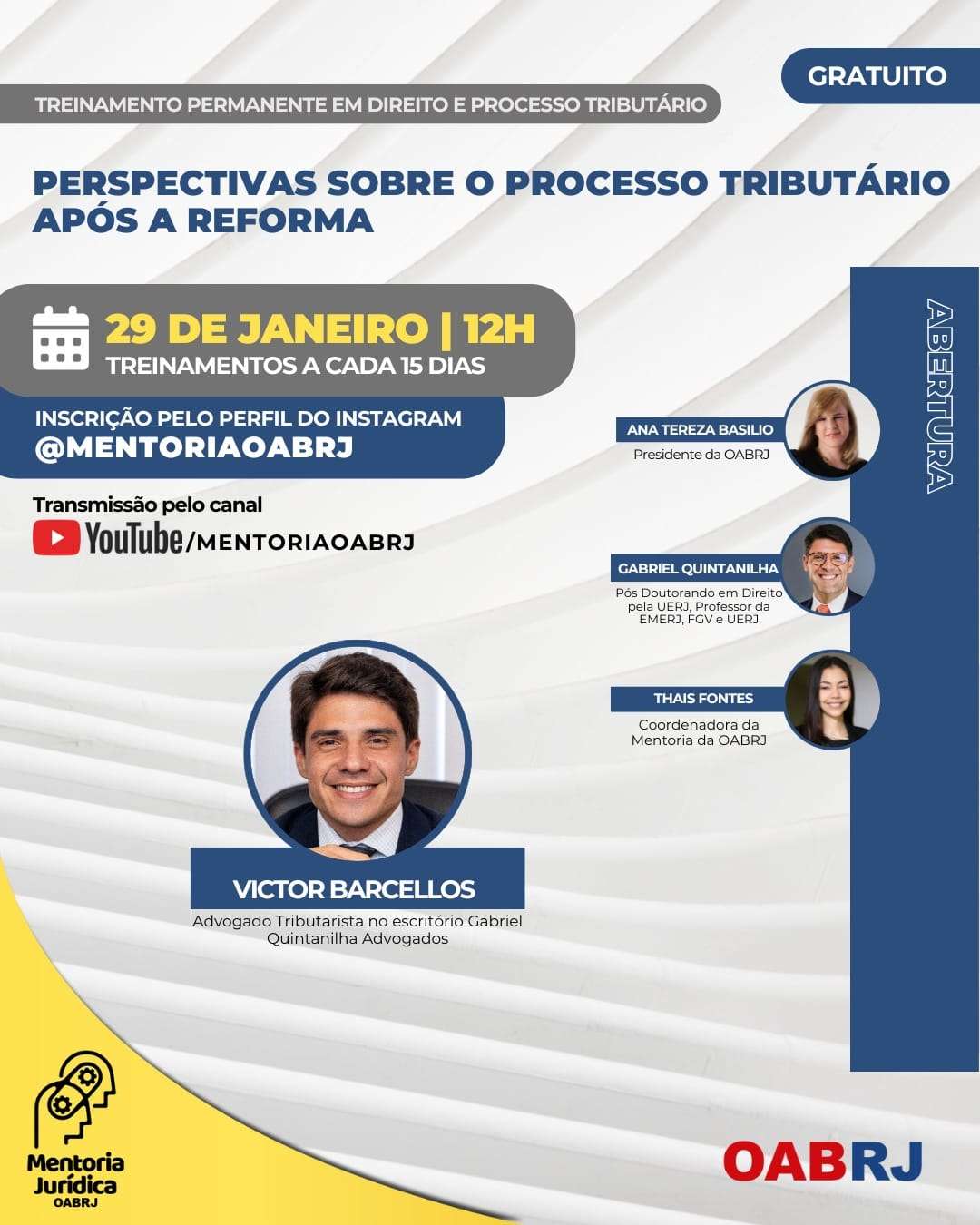 Também estarão no encontro virtual e gratuito, a Coordenadora da Mentoria da OAB-RJ, Thais Fontes, o professor e advogado Gabriel Quintanilha e o advogado tributarista, Victor Barcellos (foto).
