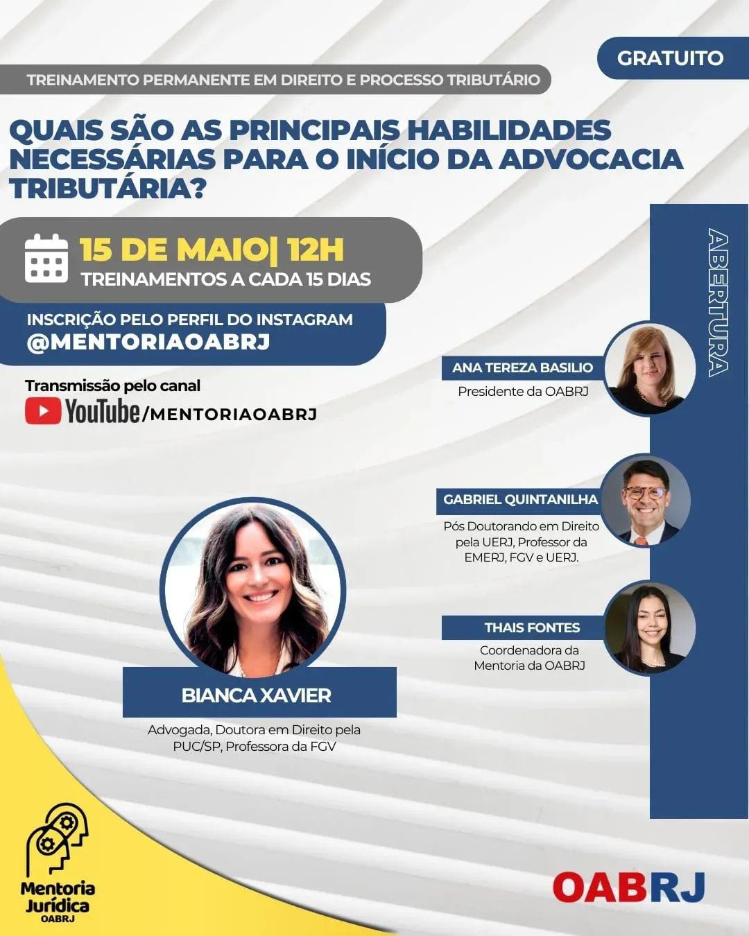 Também estarão no encontro virtual e gratuito, a Coordenadora da Mentoria da OAB-RJ, Thais Fontes, o advogado Gabriel Quintanilha e a advogada Bianca Xavier.