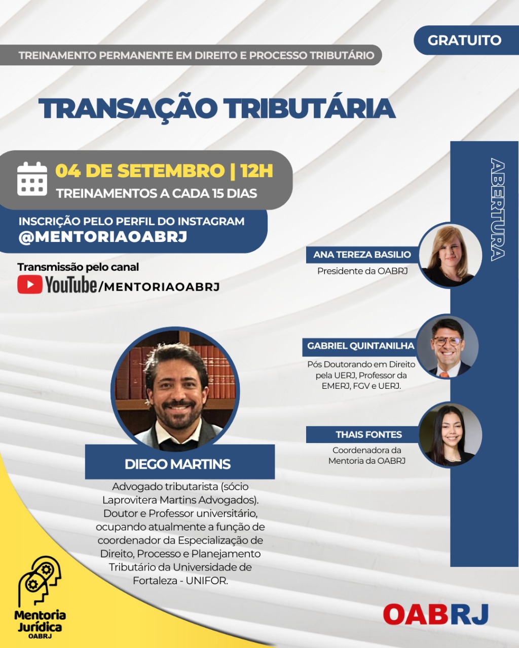 Também estarão no encontro virtual e gratuito, a Coordenadora da Mentoria da OAB-RJ, Thais Fontes, e o professor Gabriel Quintanilha e o advogado Diego Martins (foto).