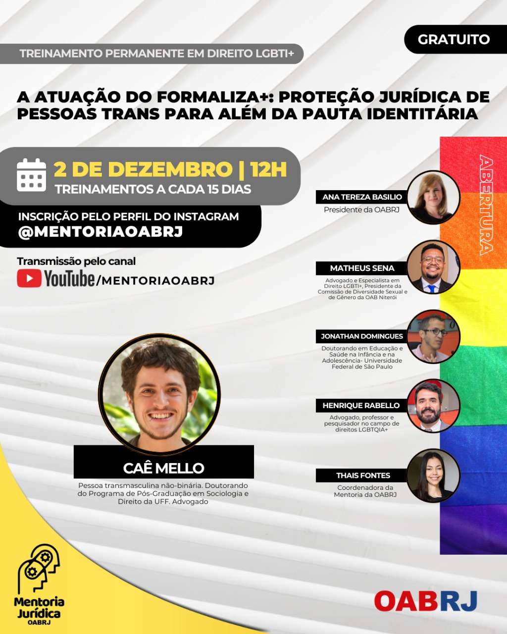 Também estarão no encontro virtual e gratuito, a Coordenadora da Mentoria da OAB-RJ, Thais Fontes, os advogados Matheus Sena, Jonathan Domingues, Henrique Rabello, e o doutorando do Programa de Pós-graduação em Sociologia e Direito da UFF, Caê Mello.