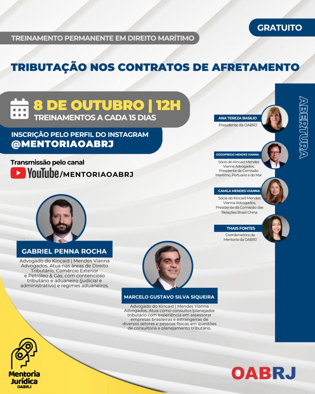 Também estarão no encontro virtual e gratuito, o presidente da comissão de Direito Marítimo, Portuário e do Mar, Godofredo Mendes Vianna, a presidente da comissão das Relações Brasil China, Camila Mendes Vianna, a Coordenadora da Mentoria da OAB-RJ, Thais Fontes, e os advogados Gabriel Penna Rocha e Marcelo Gustavo Silva Siqueira.