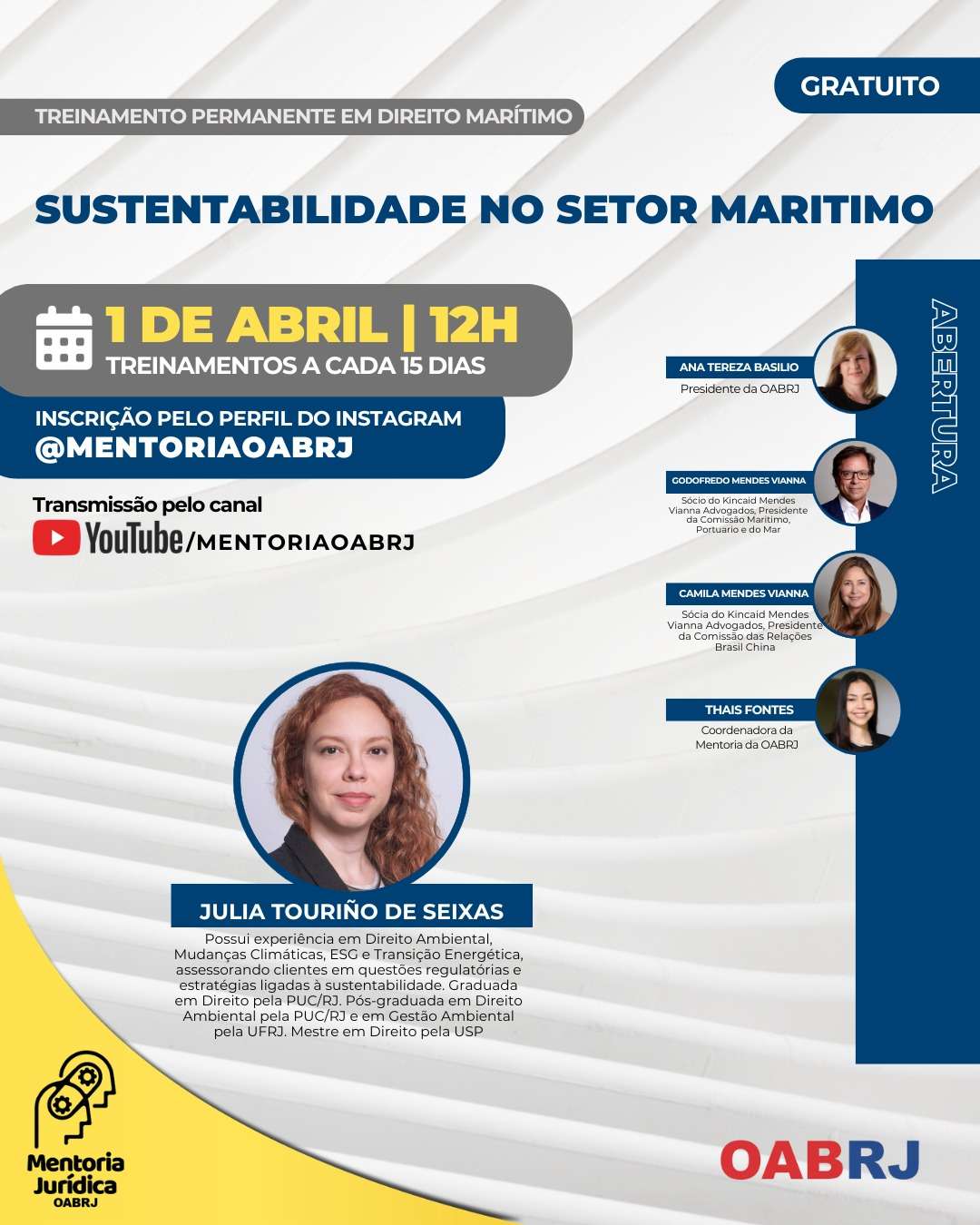 Presidente da OAB-RJ, Ana Tereza Basílio vai proferir a palestra de abertura do Treinamento Permanente em Direito Marítimo, nesta segunda-feira, dia primeiro de abril, às 12h, pelo canal YouTube mentoriaoabrj, com o tema ” Sustentabilidade no setor marítimo “.