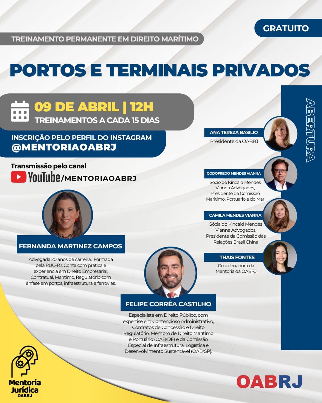 Presidente da OAB-RJ, Ana Tereza Basílio vai proferir a palestra de abertura do Treinamento Permanente em Direito Marítimo, nesta quarta-feira, dia 9 de abril, às 12h, pelo canal YouTube mentoriaoabrj, com o tema ” Portos e Terminais Privados “.