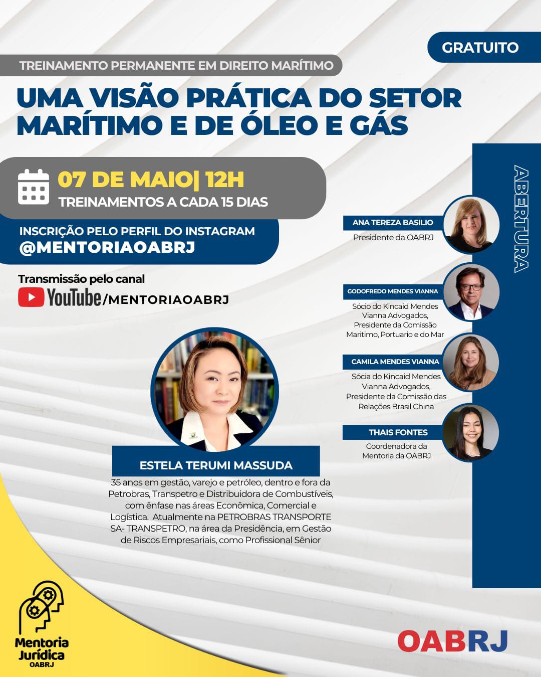 Também estarão no encontro virtual e gratuito, a Coordenadora da Mentoria da OAB-RJ, Thais Fontes, o presidente da comissão Marítimo, Portuário e do Mar, Godofredo Mendes Vianna, a presidente da comissão de Relações Brasil China, Camila Mendes Vianna, e Estela Terumi Massuda, especialista no setor.