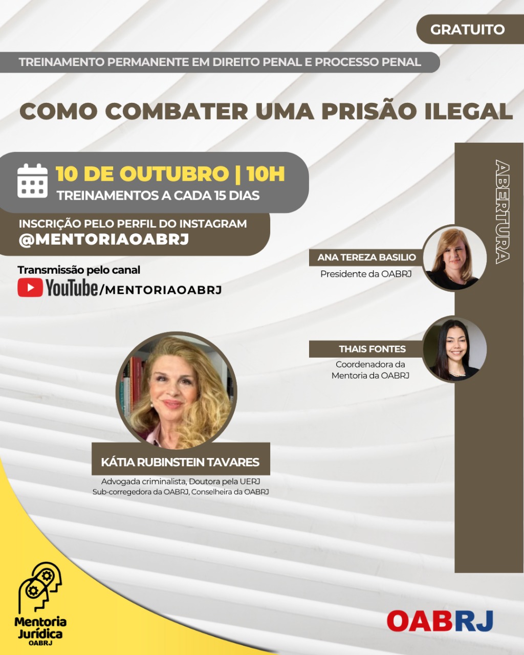Também estarão no encontro virtual e gratuito, a Coordenadora da Mentoria da OAB-RJ, Thais Fontes, e a advogada criminalista, doutora pela UERJ, conselheira e sub-coreegedora da seccional.