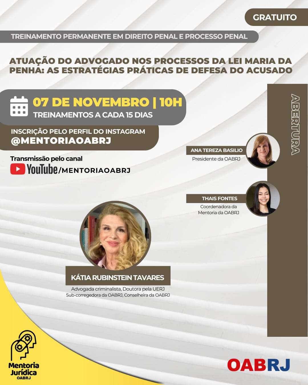 Também estarão no encontro virtual e gratuito, a Coordenadora da Mentoria da OAB-RJ, Thais Fontes, e a advogada criminalista, doutora pela UERJ, sub-corregedora e conselheira da seccional, Kátia Tavares.