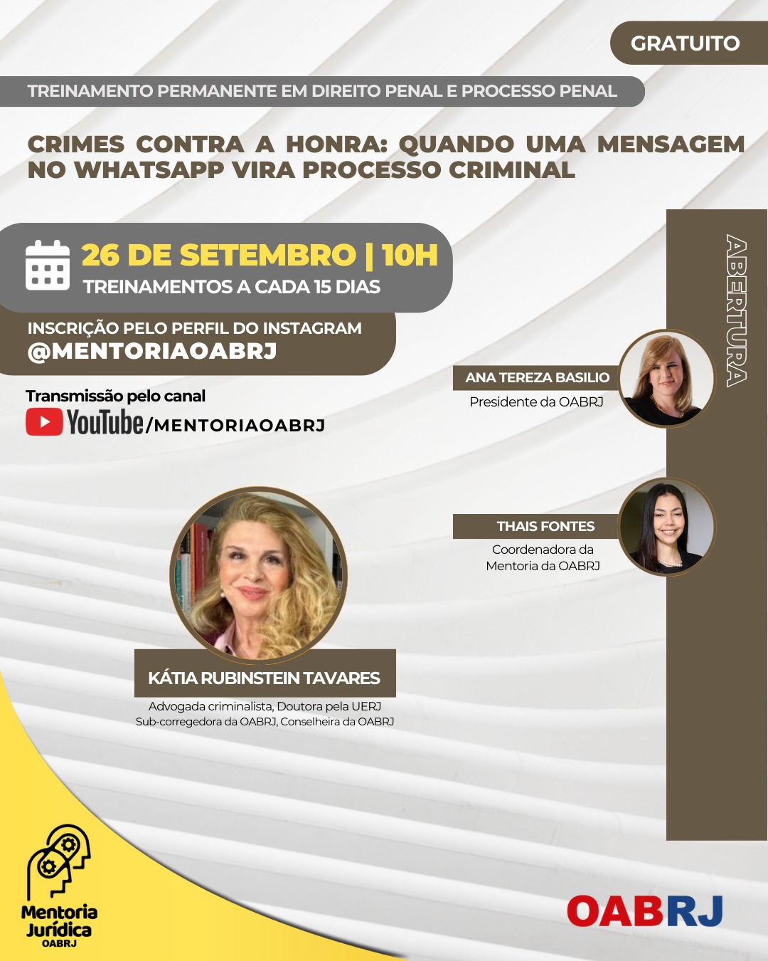 Presidente da OAB-RJ, Ana Tereza Basílio vai proferir a palestra de abertura do Treinamento Permanente em Direito Penal e Processo Penal, nesta sexta-feira, dia 26 de setembro, às 10h, pelo canal YouTube mentoriaoabrj, com o tema ” Crimes contra a honra: Quando uma mensagem no WhatsApp vira processo criminal “.