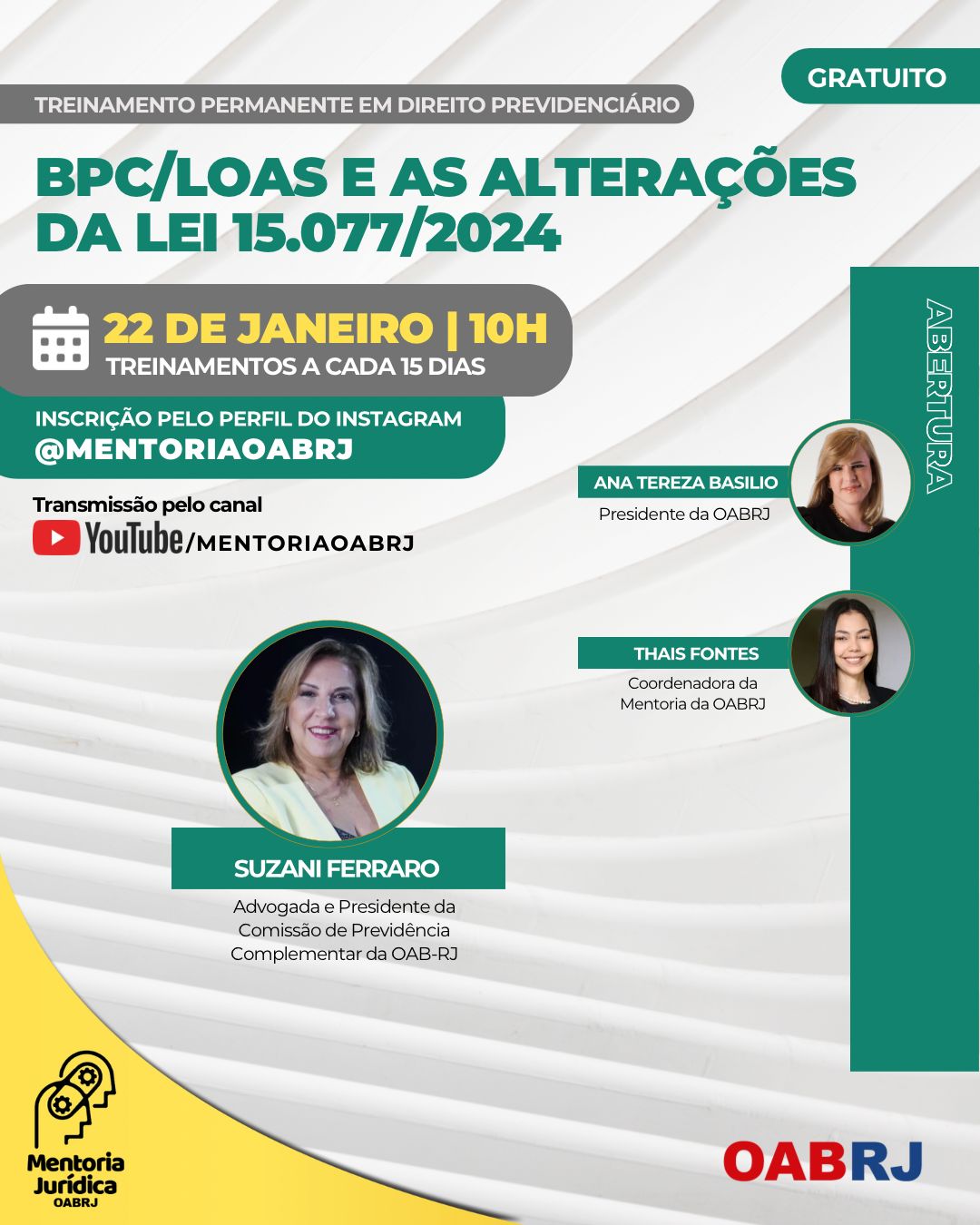 Presidente da OAB-RJ, Ana Tereza Basílio vai proferir a palestra de abertura do Treinamento Permanente em Direito Previdenciário, nesta quarta, dia 22 de janeiro,  às 10h,  pelo canal YouTube mentoriaoabrj, com o tema ” BPC/ LOAS ( Benefício de Prestação Continuada garantido pela Lei Orgânica de Prestação Continuada) e as alterações da Lei 15.077/2024.