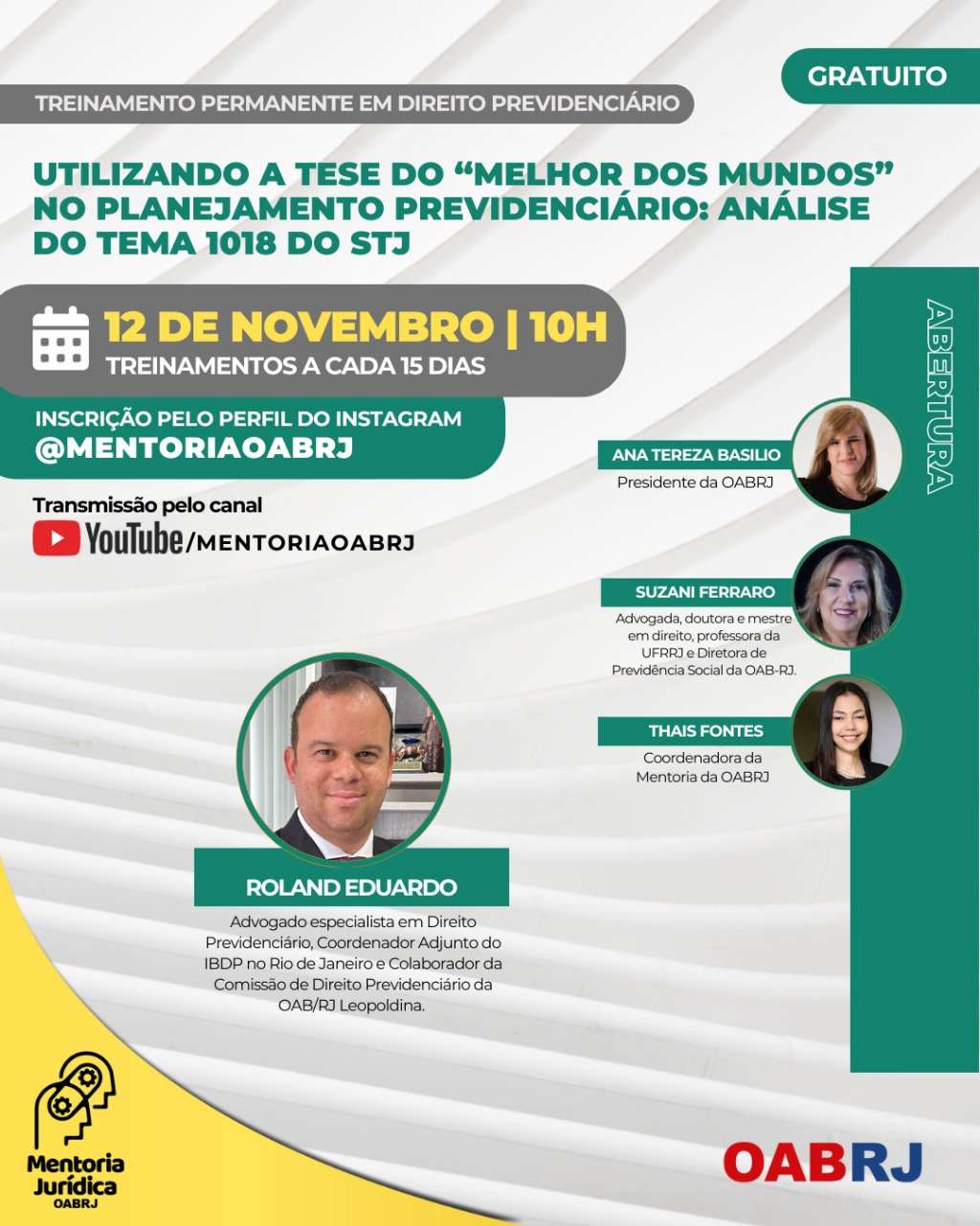 Também estarão no encontro virtual e gratuito, a Coordenadora da Mentoria da OAB-RJ, Thais Fontes, a Diretora de Previdência Social da seccional, Suzani Ferraro,e o advogado Roland Eduardo (foto).