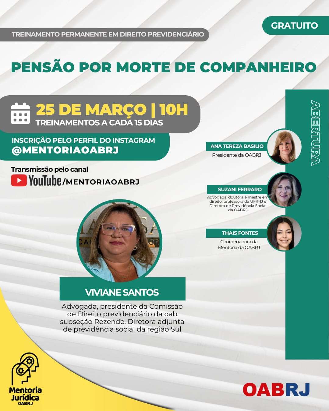 Também estarão no encontro virtual e gratuito, a Coordenadora da Mentoria da OAB-RJ, Thais Fontes, e as advogadas Suzani Ferraro e Viviane Santos (foto).