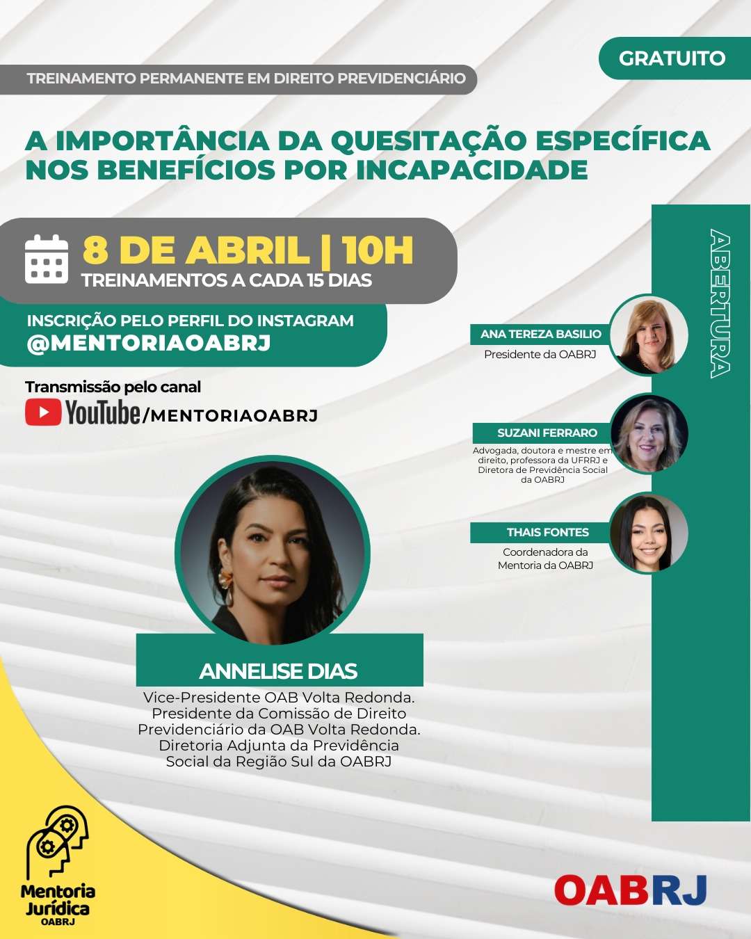 Presidente da OAB-RJ, Ana Tereza Basílio vai proferir a palestra de abertura do Treinamento Permanente em Direito Previdenciário, nesta quarta-feira, dia 8 de abril, às 10h, pelo canal YouTube mentoriaoabrj, com o tema ” A importância da quesitação específica nos benefícios por incapacidade”.