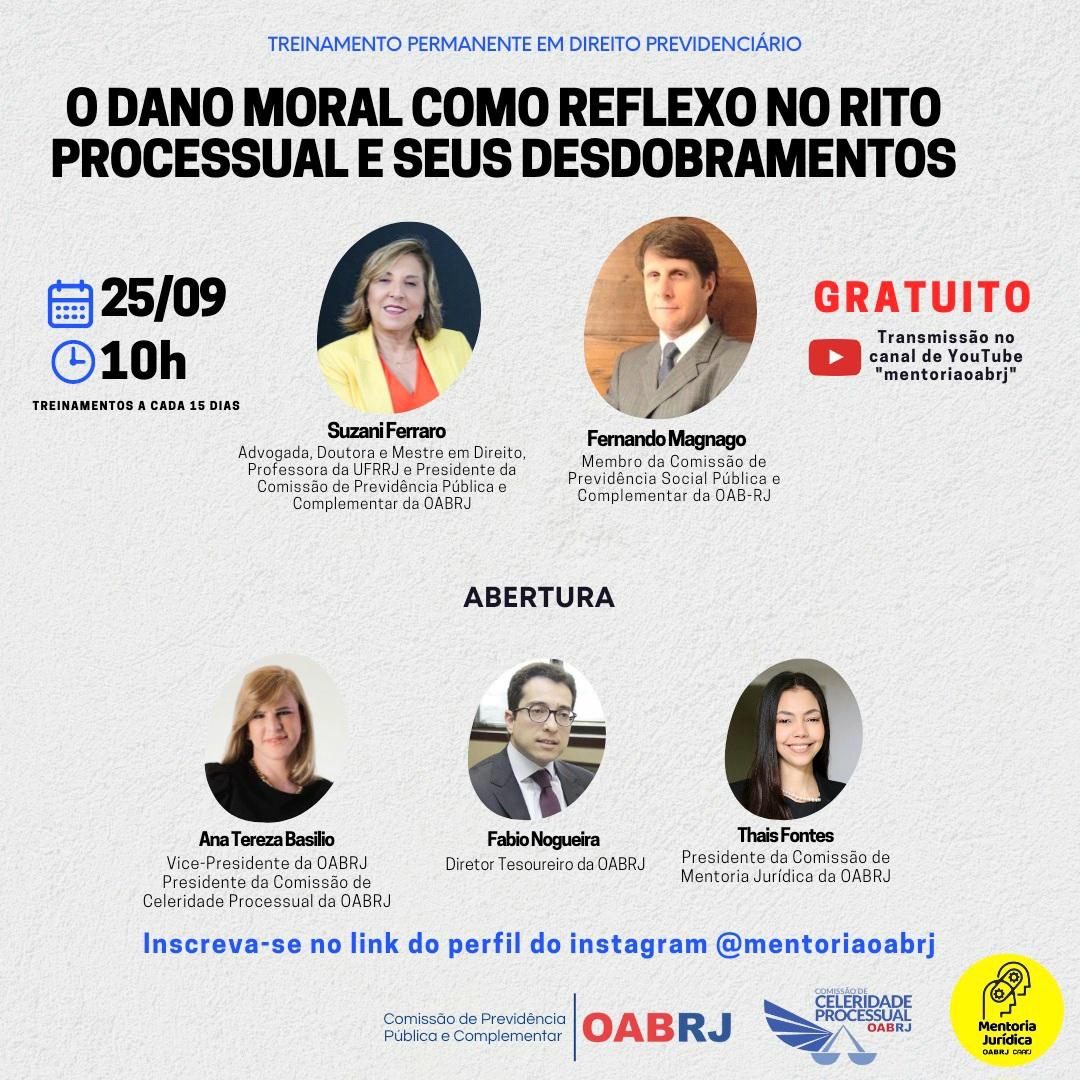 Também estarão no encontro virtual, a presidente da comissão de Previdência Pública e Complementar da OAB-RJ, Suzani Ferraro, o advogado Fernando Magnago, o Diretor Tesoureiro, Fabio Nogueira, e a presidente da comissão de Mentoria Jurídica, Thais Fontes.