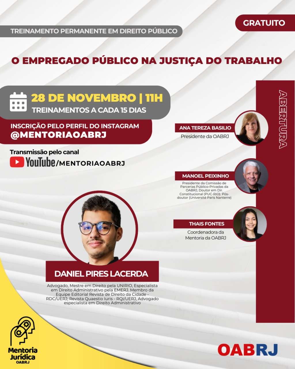 Também estarão no encontro virtual e gratuito, a Coordenadora da Mentoria da OAB-RJ, Thais Fontes, o presidente da comissão de Parcerias Público-Privadas da seccional, doutor em Direito Constitucional pela PUC-RJ e pós-doutor pela Universidade de Paris Nanterre, Manoel Peixinho, e o advogado e mestre em Direito pela Unirio, Daniel Pires Lacerda.