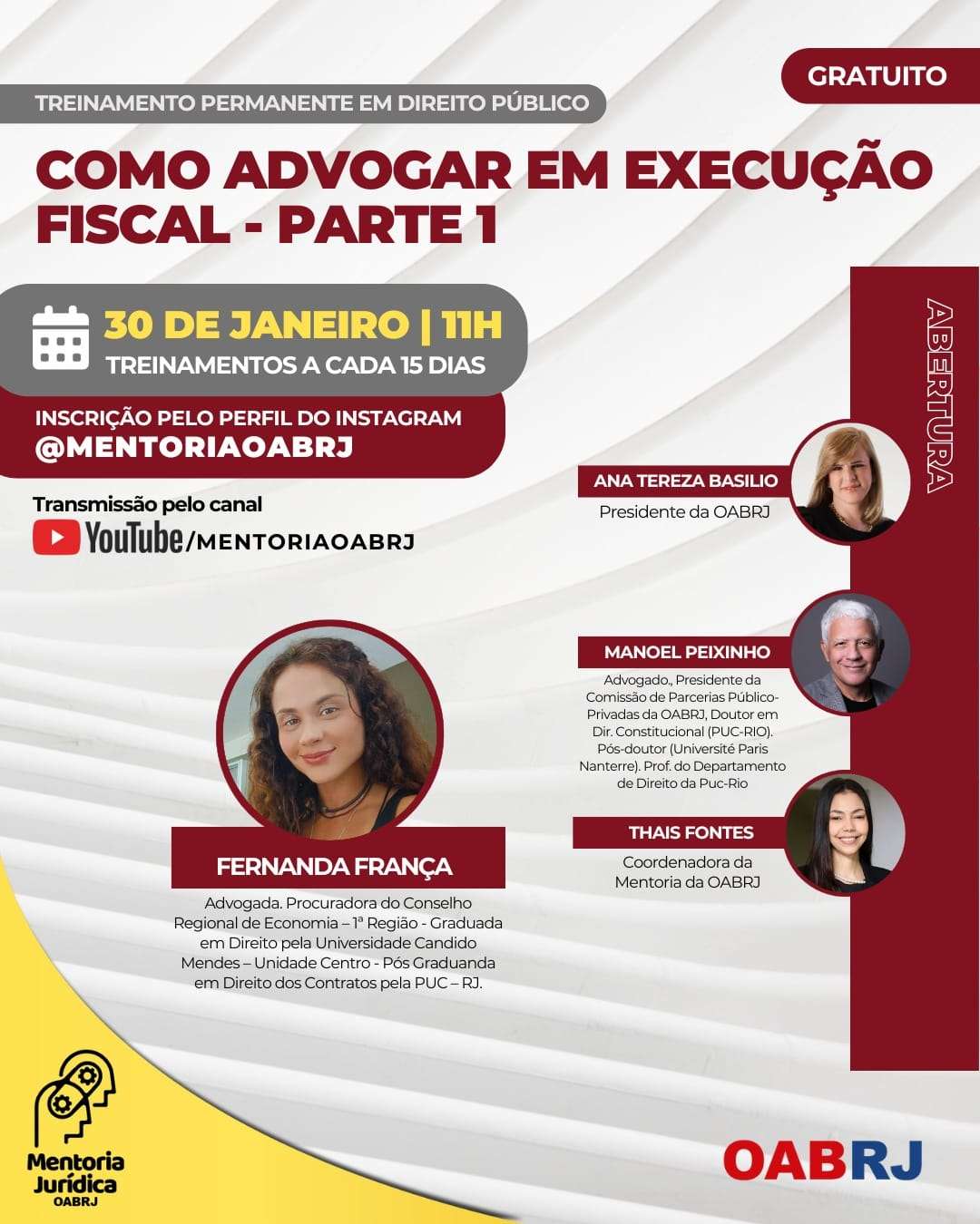 Também estarão no encontro virtual e gratuito, a Coordenadora da Mentoria da OAB-RJ, Thais Fontes, o presidente da comissão de Parcerias Público-Privadas da seccional, doutor em Direito Constitucional, Manoel Peixinho, e a advogada e procuradora do Conselho Regional de Economia, Fernanda França (foto).