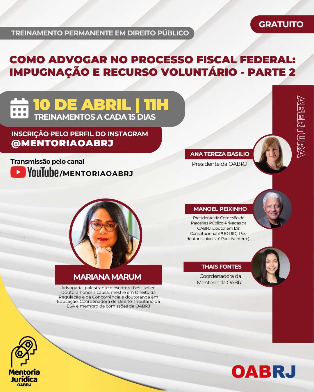 Também estarão no encontro virtual e gratuito, a coordenadora da Mentoria da OAB-RJ, Thais Fontes, o presidente da comissão de Parcerias Público-Privadas, Manoel Peixinho, e a advogada Mariana Marum.