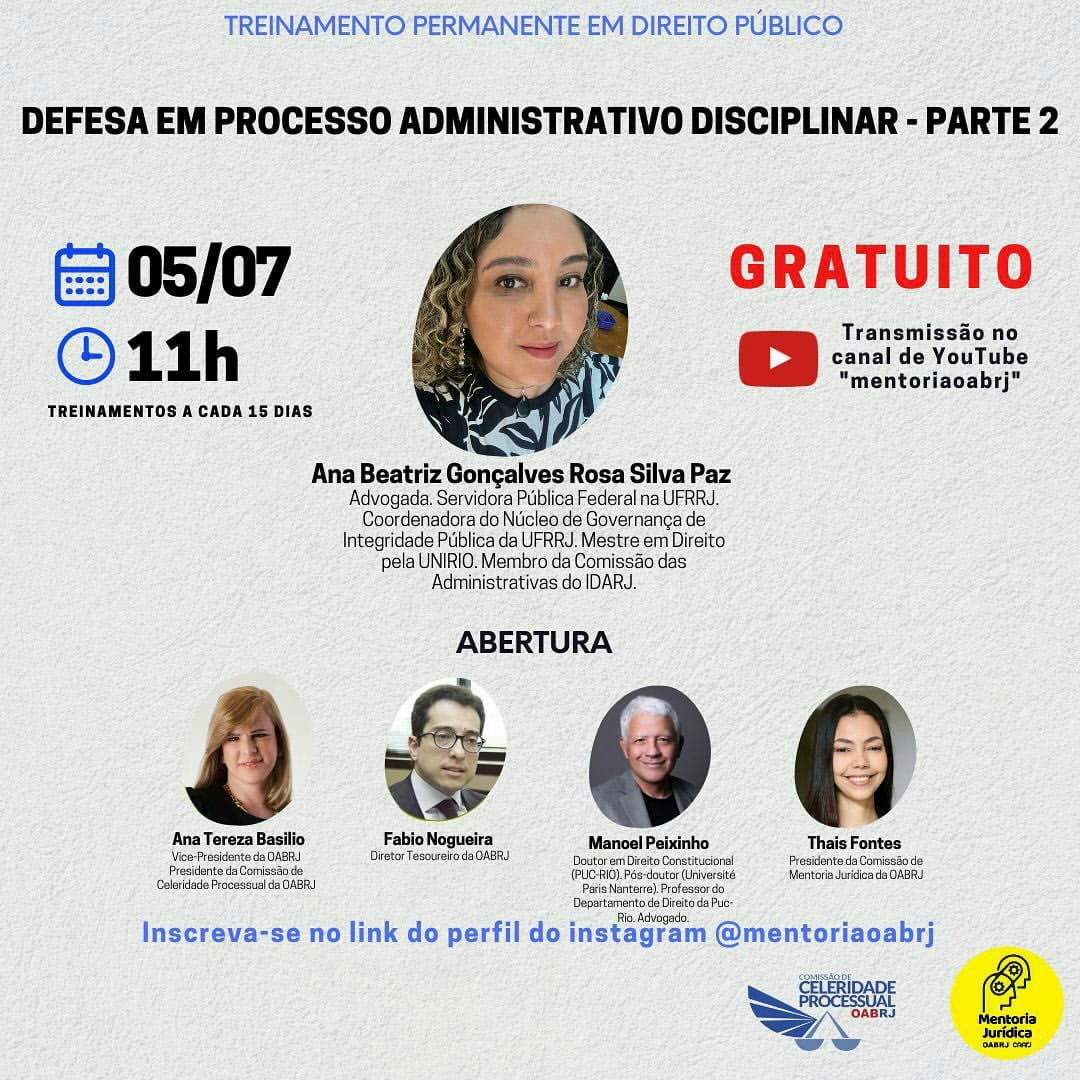 Vice-presidente da OAB-RJ e presidente da comissão de celeridade processual, Ana Tereza Basílio fará a palestra de abertura, nesta sexta-feira, dia 5 de julho, às 11h, do Treinamento Permanente em Direito Público, com o tema ” Defesa em Processo Administrativo Disciplinar- Parte 2″ , pelo canal YouTube mentoriaoabrj.