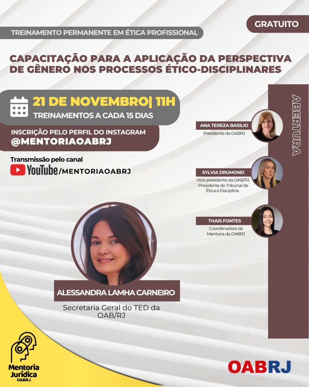Também estarão no encontro virtual e gratuito, a Coordenadora da Mentoria da OAB-RJ, Thais Fontes, a vice-presidente da seccional e presidente do Tribunal de Ética e Disciplina, Sylvia Drummond, e a secretária-geral do TED, Alessandra Lamha.