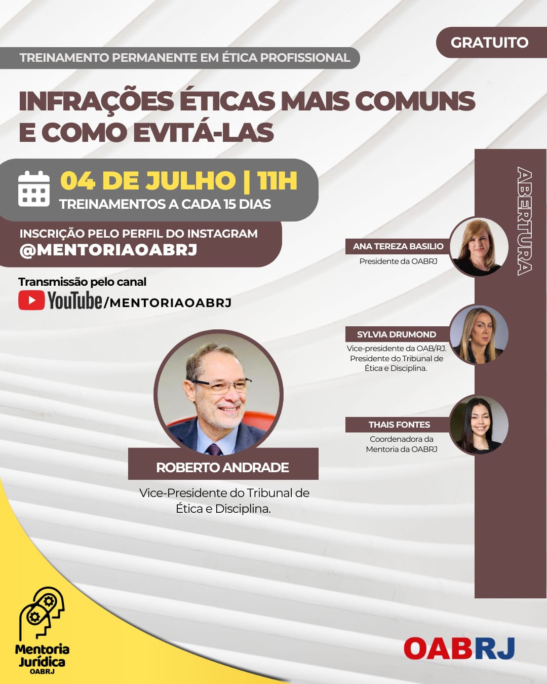 Também estarão no encontro virtual e gratuito, a vice-presidente da OAB-RJ e presidente do Tribunal de Ética, Sylvia Drummond, o vice-presidente do TED, Roberto Andrade, e a Coordenadora da Mentoria, Thais Fontes.
