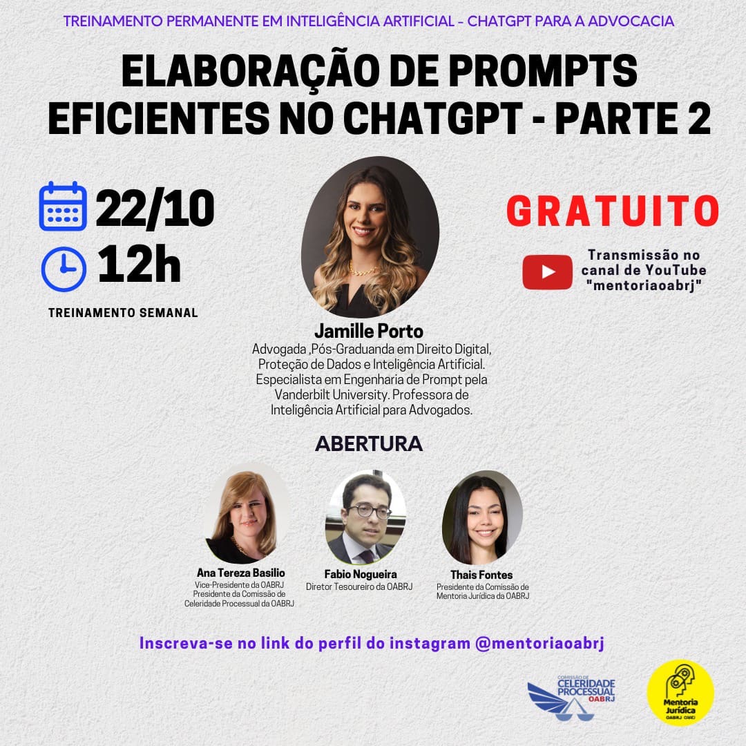 Vice-presidente da OAB-RJ e presidente da comissão de celeridade processual, Ana Tereza Basílio vai proferir a palestra de abertura, nesta terça-feira, dia 22 de outubro, às 12h, do Treinamento Permanente em Inteligência Artificial, com o tema ” Elaboração de Prompts Eficientes no Chatgpt”, pelo canal YouTube mentoriaoabrj. As inscrições podem ser feitas pelo istagram @mentoriaoabrj.