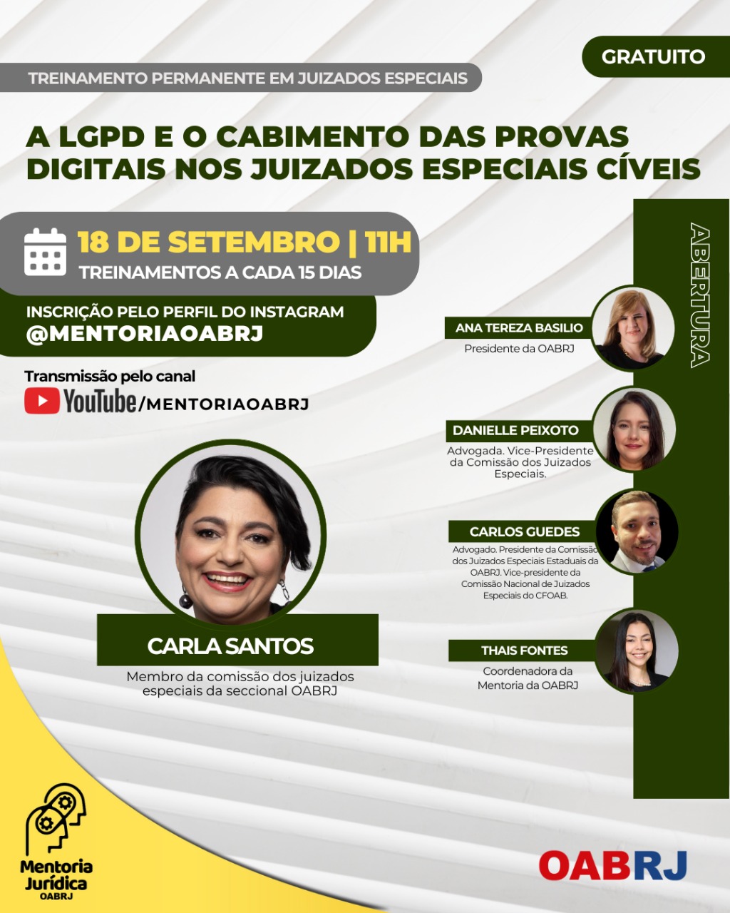 Também estarão no encontro virtual e gratuito, a Coordenadora da Mentoria da OAB-RJ, Thais Fontes,  o presidente da comissão de Juizados Especiais Estaduais da seccional,  Carlos Guedes,  a vice-presidente,  Danielle Peixoto,  e Carla Santos,  que também é integrante da comissão (foto).