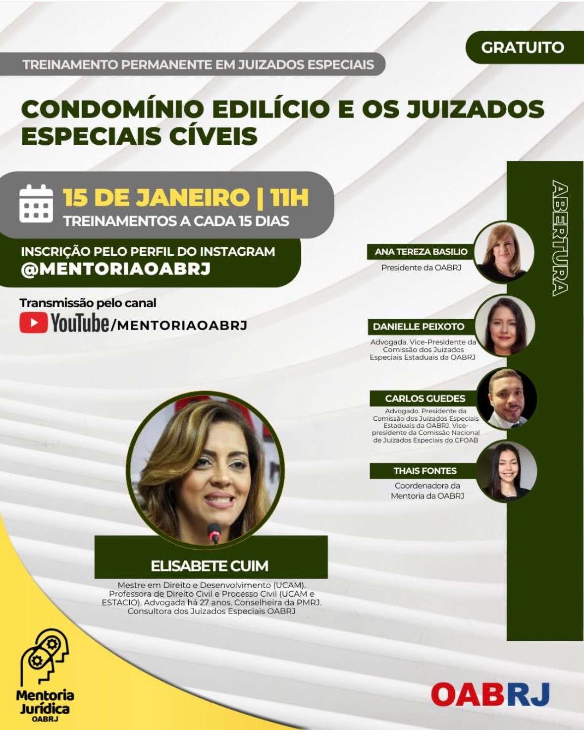 Também estarão no encontro virtual e gratuito, a Coordenadora da Mentoria da OAB-RJ, Thais Fontes, o presidente da comissão dos Juizados Especiais Estaduais da OAB-RJ, Carlos Guedes, a vice-presidente, Danielle Peixoto, e a professora e advogada Elizabete Cuim (foto)