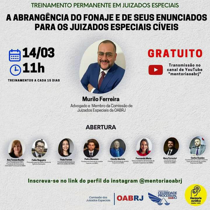 Também estarão no encontro virtual, o procurador-geral geral da OAB-RJ, Fabio Nogueira, a presidente da comissão de Mentoria Jurídica da seccional, Thais Fontes, o presidente da comissão de Juizados Especiais, Pedro Menezes, e dos advogados Murilo Ferreira, Claudio Marinho, Fernanda Mata, Mano Fornaciari e Carlos Guedes.