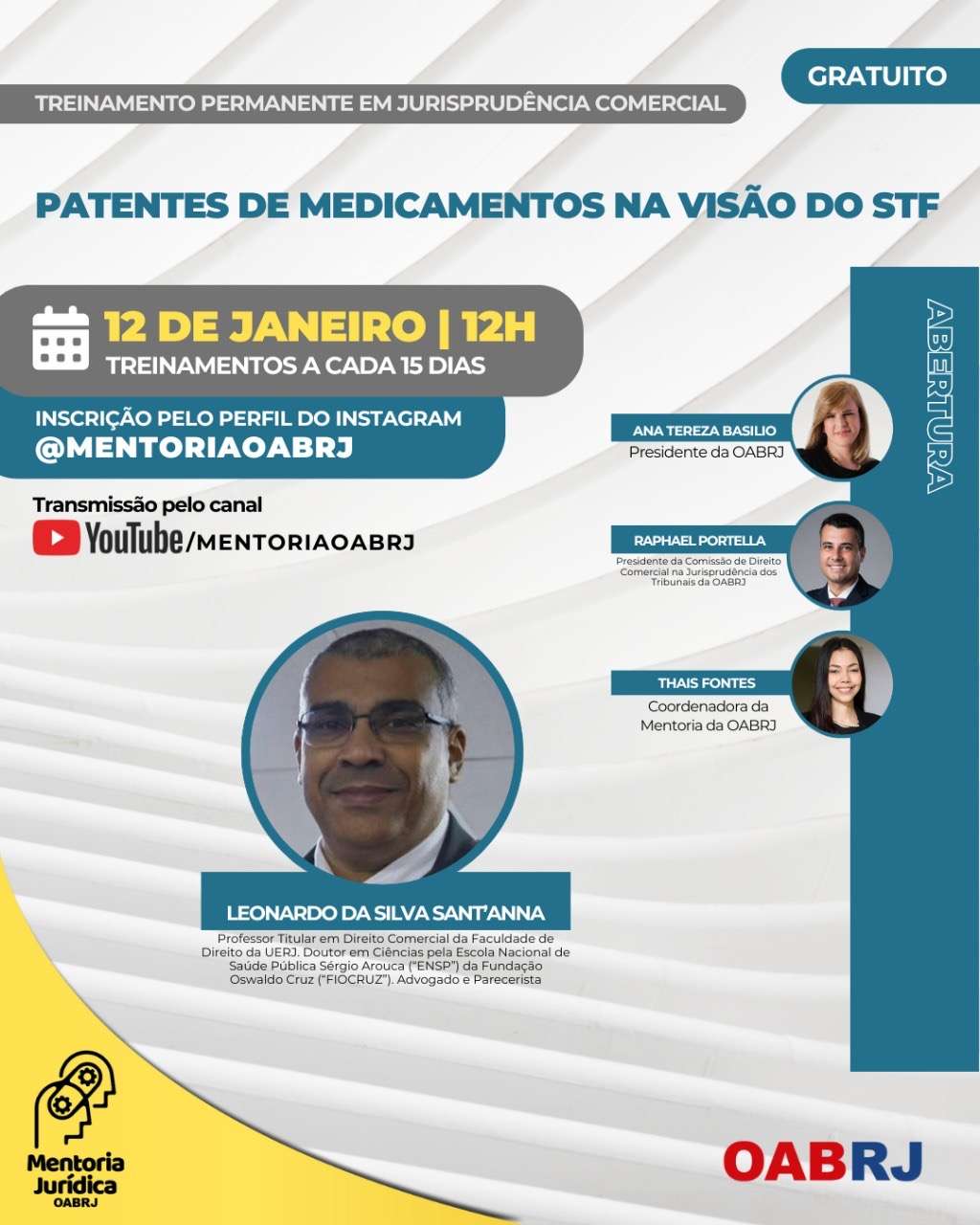 Também estarão no encontro virtual e gratuito, o professor Titular em Direito Comercial da Faculdade de Direito da UERJ, Leonardo S’Antanna , o presidente da comissão de Direito Comercial na Jurisprudência dos Tribunais da OAB-RJ, Raphael Portella, e a Coordenadora da Mentoria, Thais Fontes.