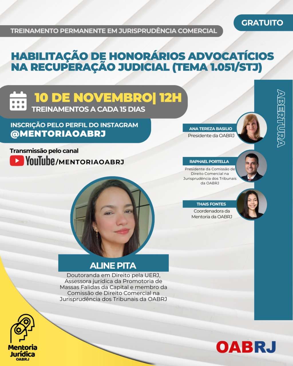 Também estarão no encontro virtual e gratuito, a Coordenadora da Mentoria da OAB-RJ, Thais Fontes, o presidente da comissão de Direito Comercial na Jurisprudência dos Tribunais, Raphael Portella, e a doutoranda em Direito pela UERJ, Aline Pita.
