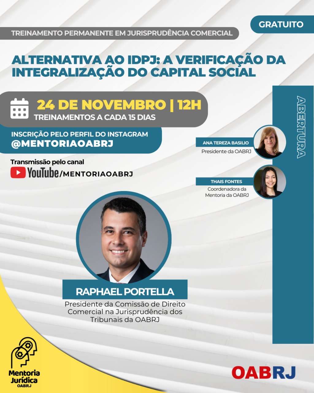 Também estarão no encontro virtual e gratuito, a Coordenadora da Mentoria da OAB-RJ, Thais Fontes, e o presidente da comissão de Direito Comercial na Jurisprudência dos Tribunais da seccional, Raphael Portella.