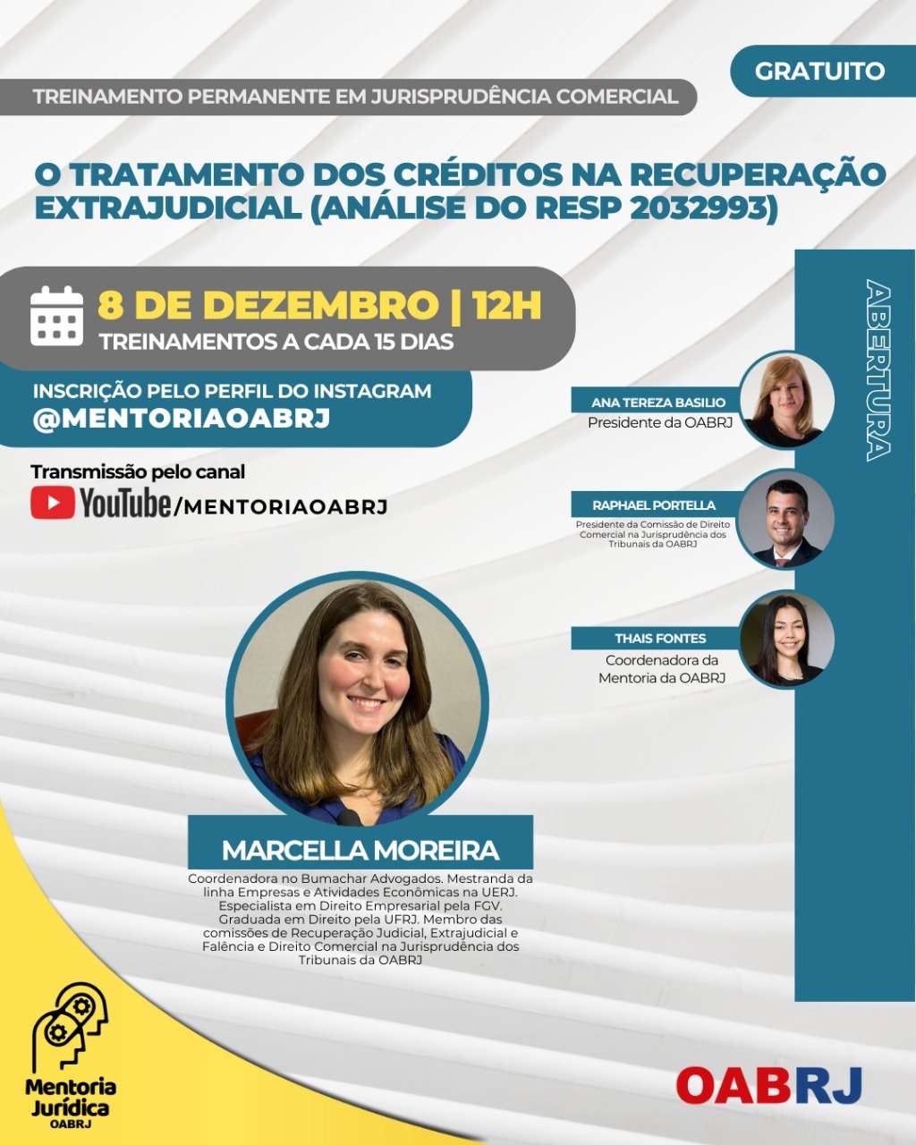 Também estarão no encontro virtual e gratuito, a Coordenadora da Mentoria da OAB-RJ, Thais Fontes , o presidente da comissão de Direito Comercial na Jurisprudência dos Tribunais da seccional, Raphael Portella, e a advogada Marcella Moreira.