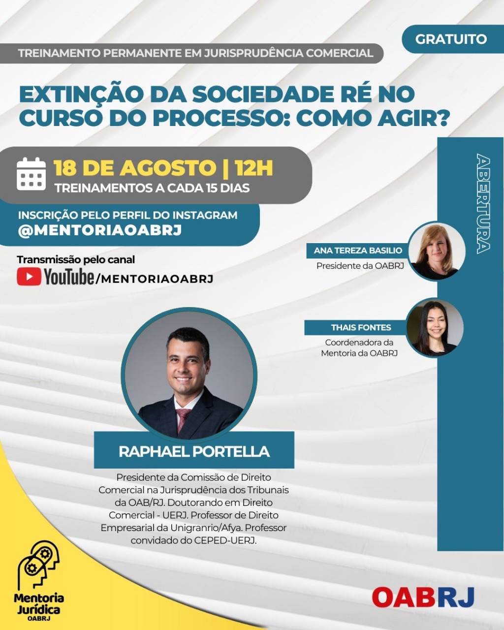Também estarão no encontro virtual e gratuito,  a Coordenadora da Mentoria da OAB-RJ, Thais Fontes, e o advogado Raphael Portella.