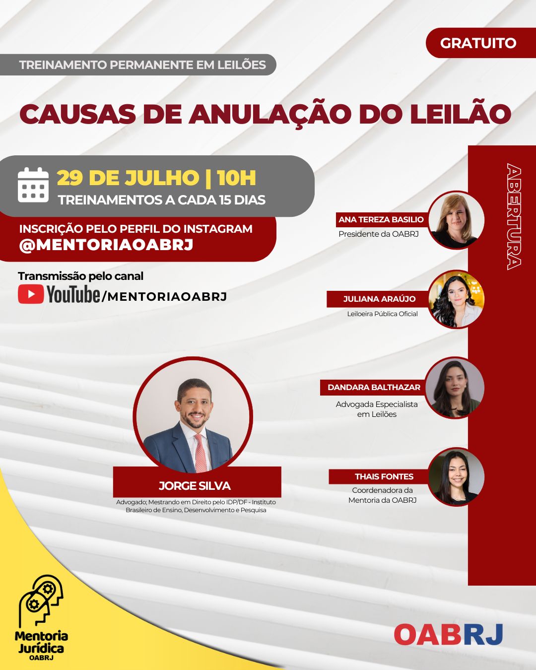 Também estarão no encontro virtual e gratuito, a Coordenadora da Mentoria da OAB-RJ, Thais Fontes, a Leiloeira Pública Oficial, Juliana Araújo, a advogada especializada em Leilões, Dandara Balthazar, e o advogado Jorge Silva.