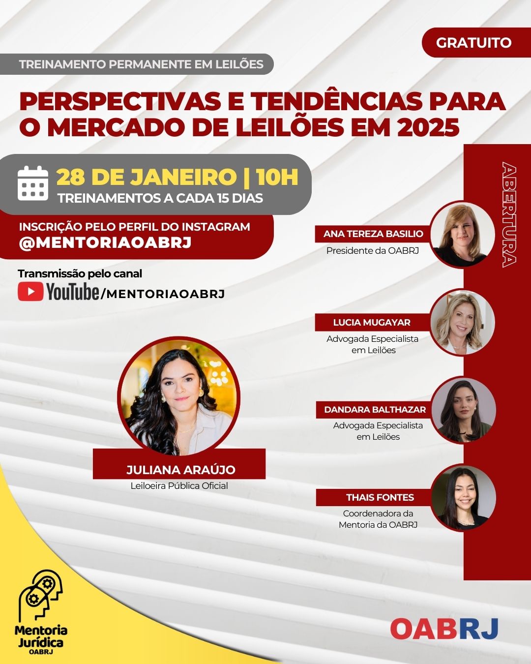 Também estarão no encontro virtual e gratuito, a Coordenadora da Mentoria da OAB-RJ, Thais Fontes, a leiloeira pública, Juliana Araújo, e as advogadas especialistas em Leilões, Lucia Mugayar e Dandara Balthazar .