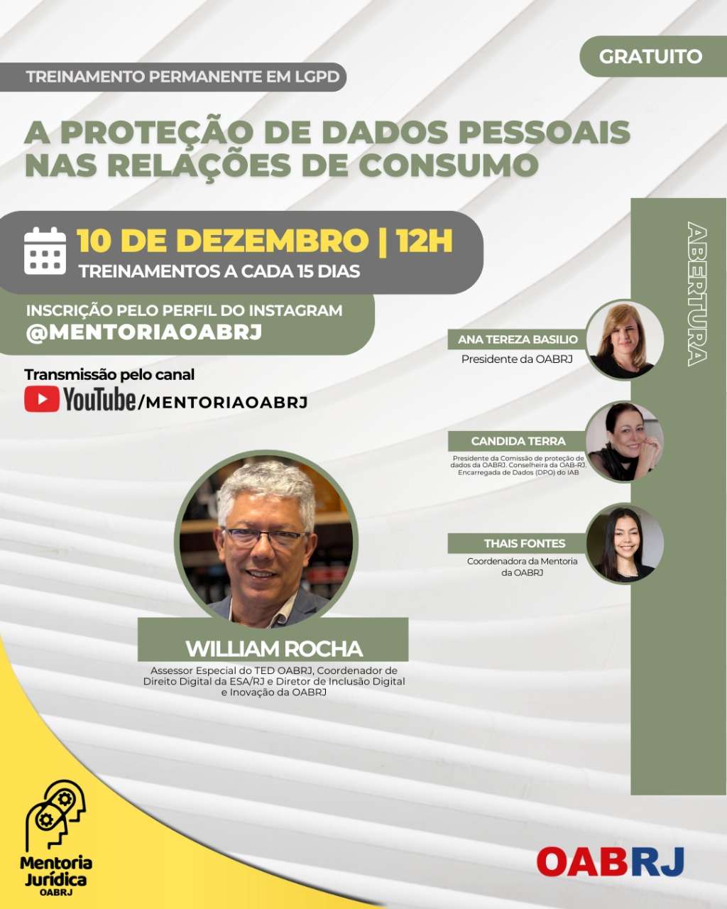 Presidente da OAB-RJ, Ana Tereza Basílio vai proferir a palestra de abertura do Treinamento Permanente em LGPD, na quarta-feira que vem, dia 10 de dezembro, pelo canal YouTube mentoriaoabrj,  com a palestra do advogado William Rocha,  Assessor Especial do Tribunal de Ética e Disciplina,  Coordenador do Direito Digital da ESA-RJ e Diretor de Inclusão Digital,  e com a participação das advogadas Candida Terra, presidente da comissão de Proteção de Dados da seccional, e Thais Fontes, Coordenadora da Mentoria (foto).