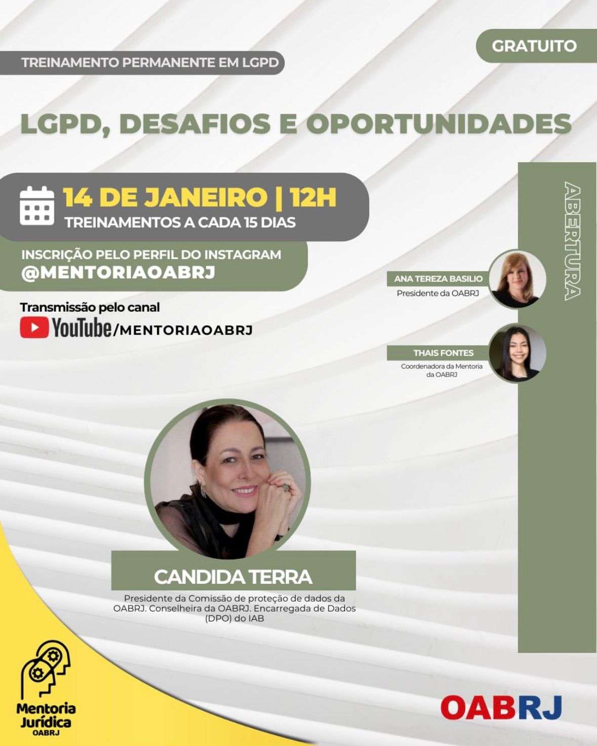Presidente da OAB-RJ, Ana Tereza Basílio vai proferir a palestra de abertura do Treinamento Permanente em LGPD (Lei Geral de Proteção de Dados), nesta quarta-feira, dia 14 de janeiro, às 12h, pelo canal YouTube mentoriaoabrj, com o tema ” LGPD, Desafios e Oportunidades “.