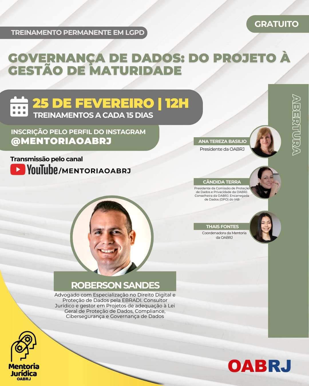 Presidente da OAB-RJ, Ana Tereza Basílio vai proferir a palestra de abertura do Treinamento Permanente em LGPD, nesta quarta-feira, dia 25 de fevereiro, às 12h, pelo canal YouTube mentoriaoabrj, com o tema “Governança de Dados: Do Projeto à Gestão de Maturidade”.