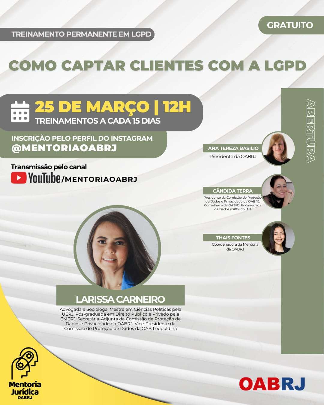 Também estarão no encontro virtual e gratuito, a Coordenadora da Mentoria da OAB-RJ, Thais Fontes , a presidente da comissão de Proteção de Dados e Privacidade,  Cândida Terra, e a advogada e socióloga, Larissa Carneiro (foto).