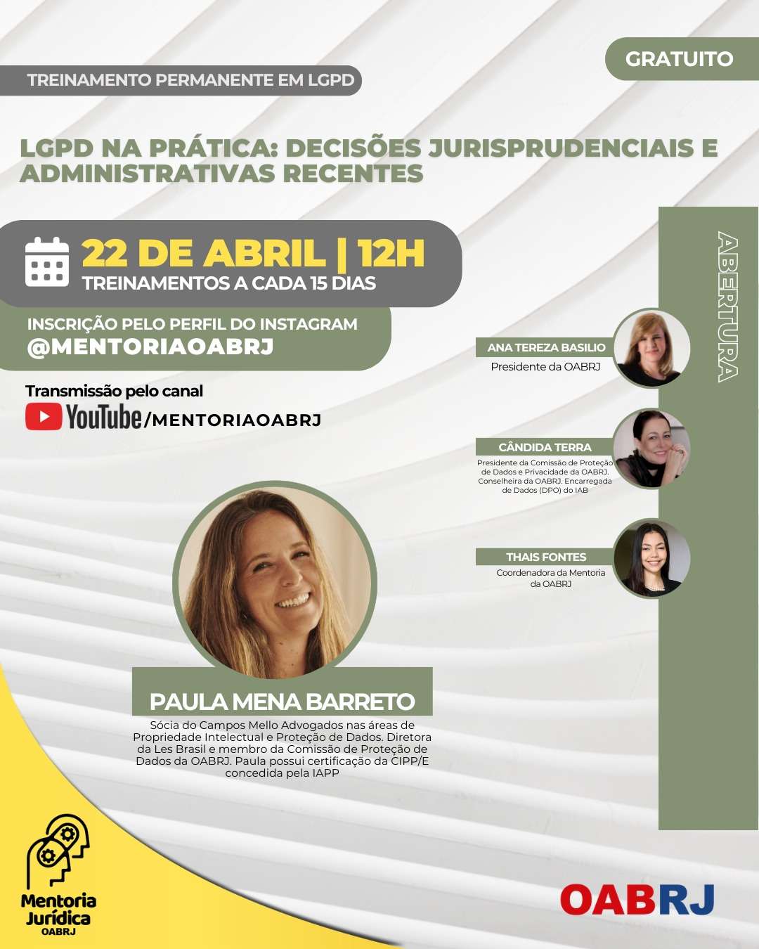 Também estarão no encontro virtual e gratuito, a coordenadora da Mentoria da OAB-RJ, Thais Fontes, a presidente da comissão de Proteção de Dados e Privacidade da OAB-RJ, Cândida Terra, e a advogada Paula Mena Barreto.
