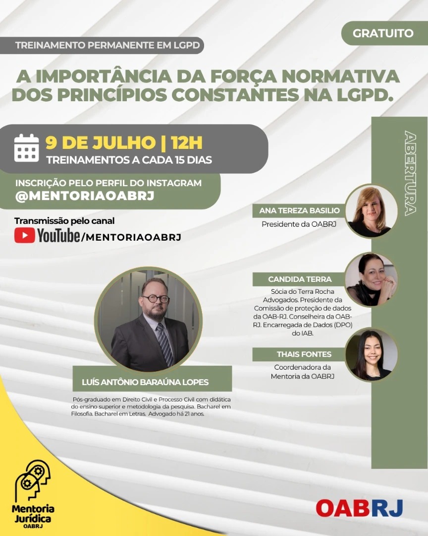 Também estarão no encontro virtual e gratuito, a presidente da comissão de Proteção de Dados da OAB-RJ, Candida Terra, a Coordenadora da Mentoria, Thais Fontes, e o advogado Luis Antônio Lopes.