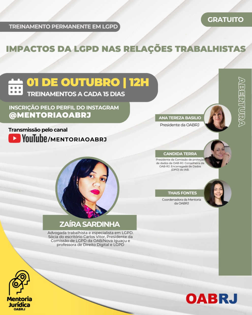 Também estarão no encontro virtual e gratuito, a Coordenadora da Mentoria da OAB-RJ, Thais Fontes, a presidente da comissão de Proteção de Dados da seccional,  Candida Terra, e a advogada Zaira Sardinha.