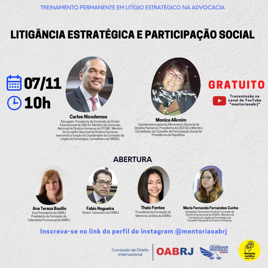 Também estarão no encontro virtual, o Diretor Tesoureiro, Fabio Nogueira, a presidente da comissão de Mentoria Jurídica, Thais Fontes, e os advogados Maria Fernanda Fernandes Cunha, Monica Alkimim e Carlos Nicodemos.