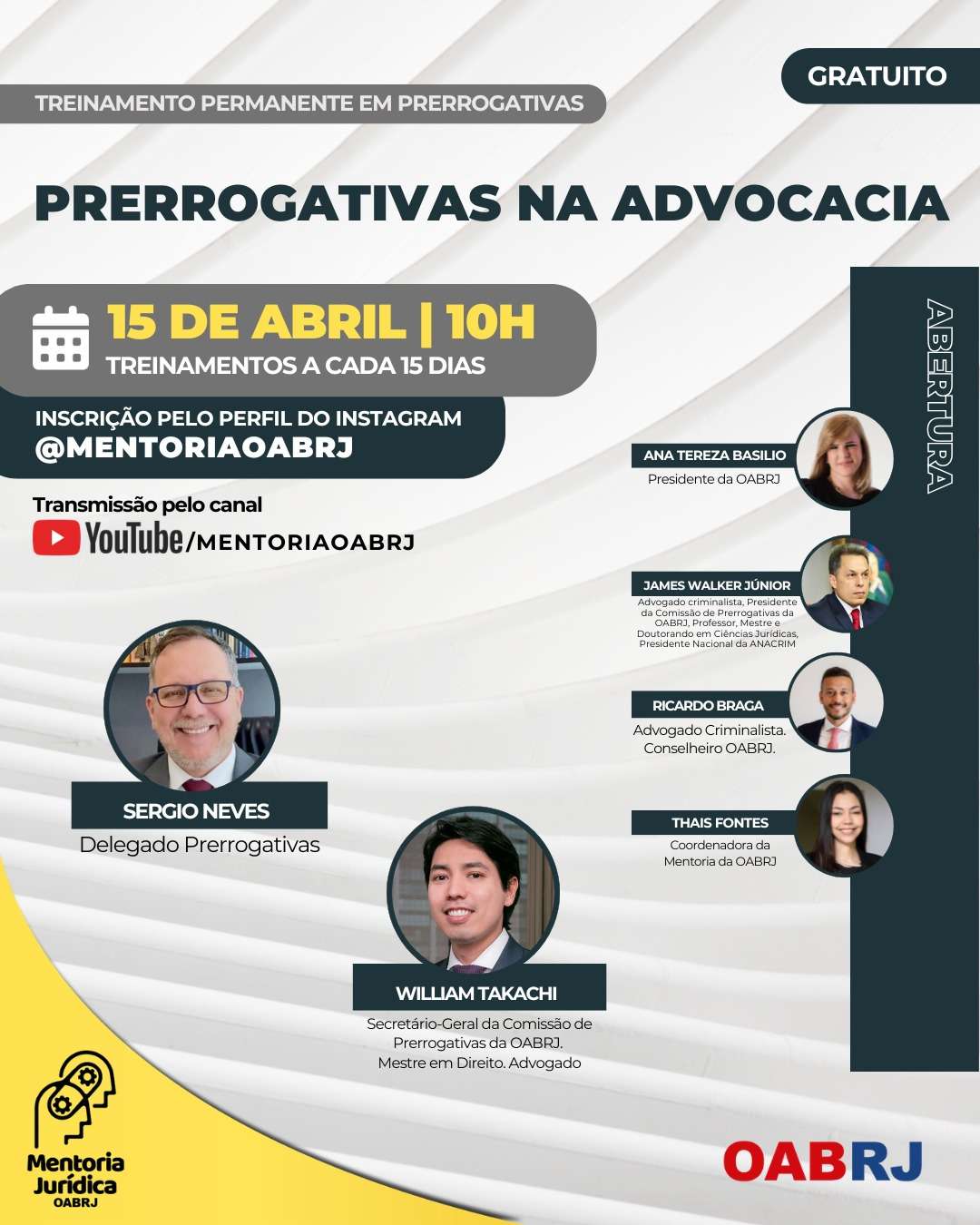 Também estarão no encontro virtual e gratuito, a coordenadora da Mentoria da OAB-RJ, Thais Fontes, e os advogados James Walker, Ricardo Braga, e William Takachi, além de Sergio Neves.