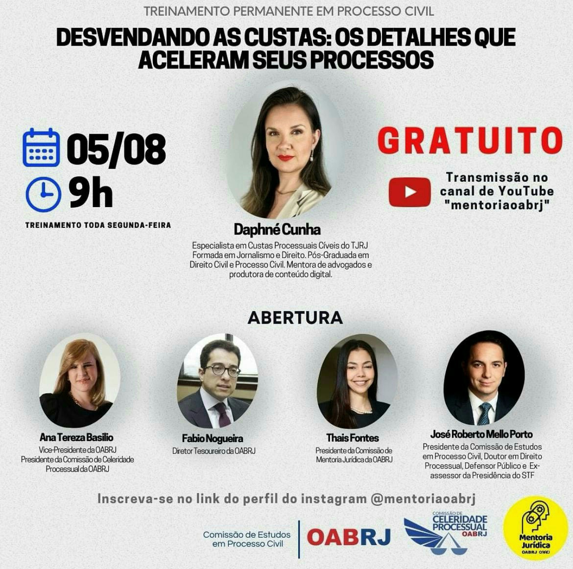 Também estarão no encontro virtual,  a advogada Daphné Cunha,  o Diretor Tesoureiro da OAB-RJ,  Fabio Nogueira,  a presidente da comissão de Mentoria Jurídica,  Thaís Fontes,  e o presidente da comissão de Estudos em Processo Civil,  José Roberto de Mello Porto.