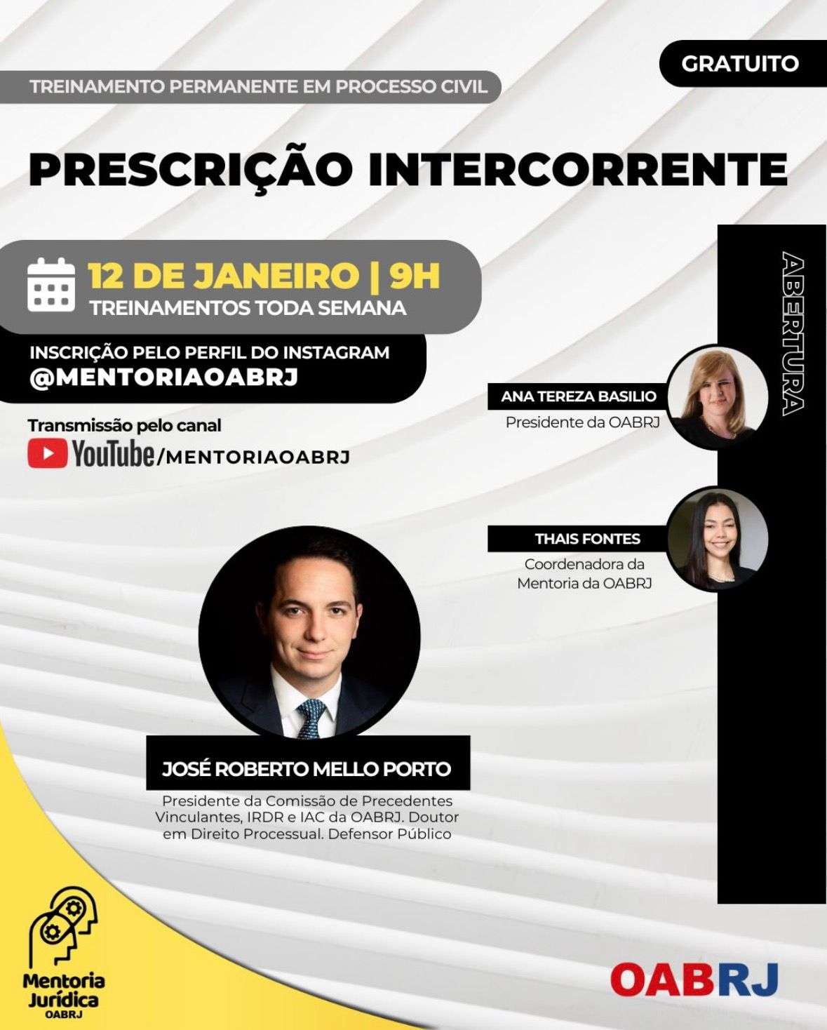 Também estarão no encontro virtual e gratuito, a Coordenadora da Mentoria da OAB-RJ, Thais Fontes, e o presidente da comissão de Precedentes Vinculantes, IRDR e IAC da seccional, José Roberto Mello Porto.