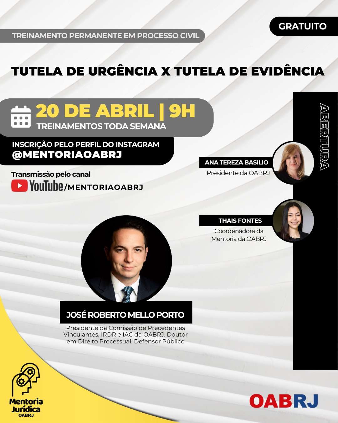 Também estarão no encontro virtual e gratuito, a coordenadora da Mentoria da OAB-RJ, Thais Fontes, e o presidente da comissão de Precedentes Vinculantes, IRDR e IAC da seccional, José Roberto Mello Porto.